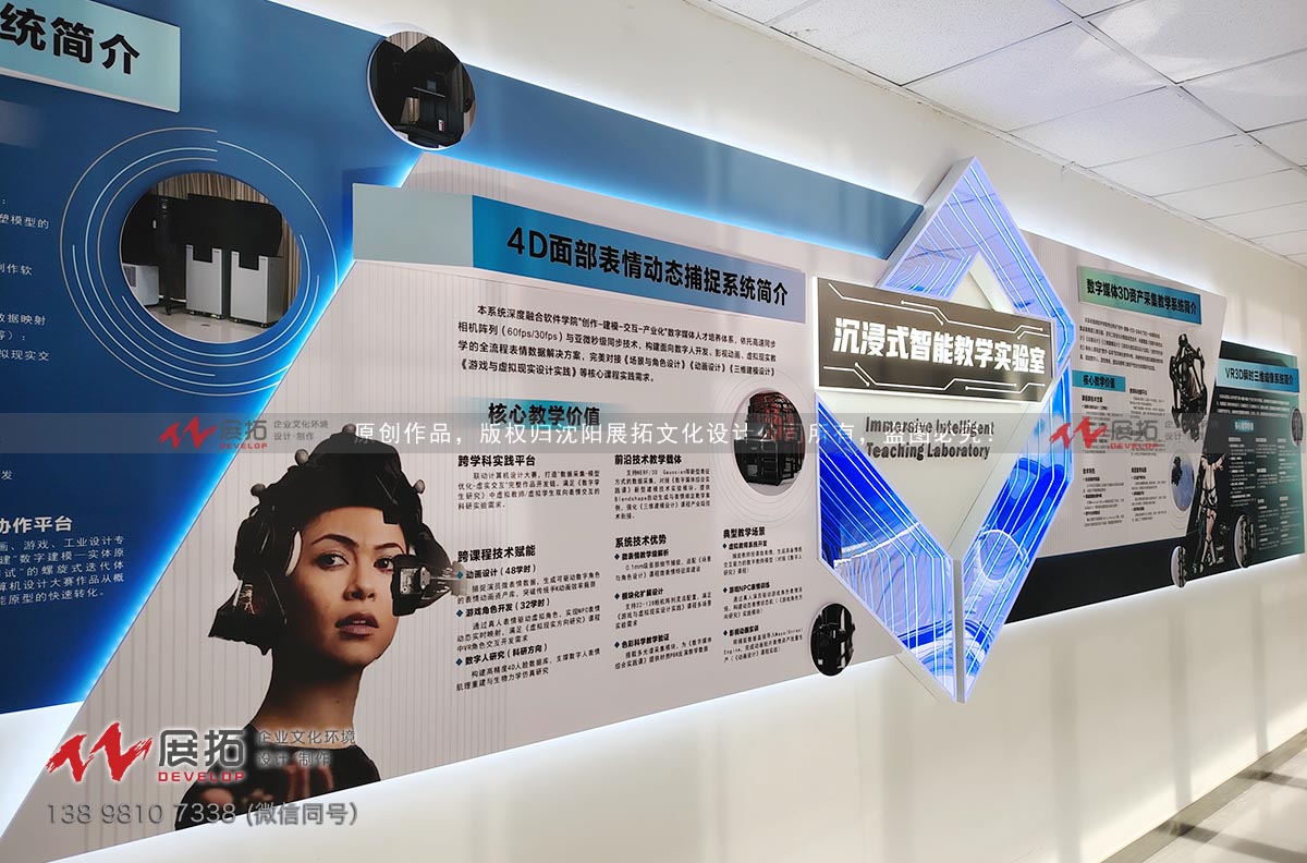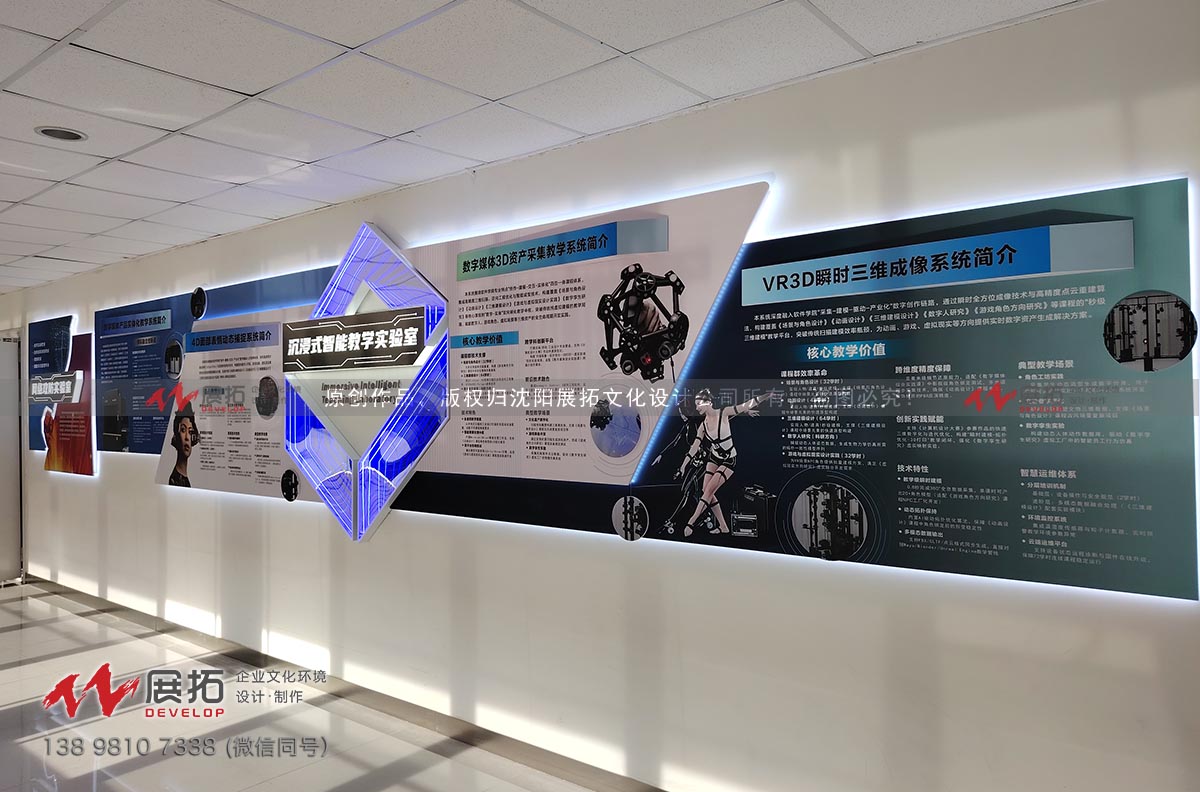 设计融入量子纠缠图形、星轨线条等元素,象征技术探索的无限可能,同时划分 “创新历程”“核心团队”“未来展望” 三大板块,用荧光材质勾勒时间轴,既展现实验室发展轨迹,又凸显前沿科技与人文创意的融合,让墙面成为连接现实与虚拟的视觉桥梁。