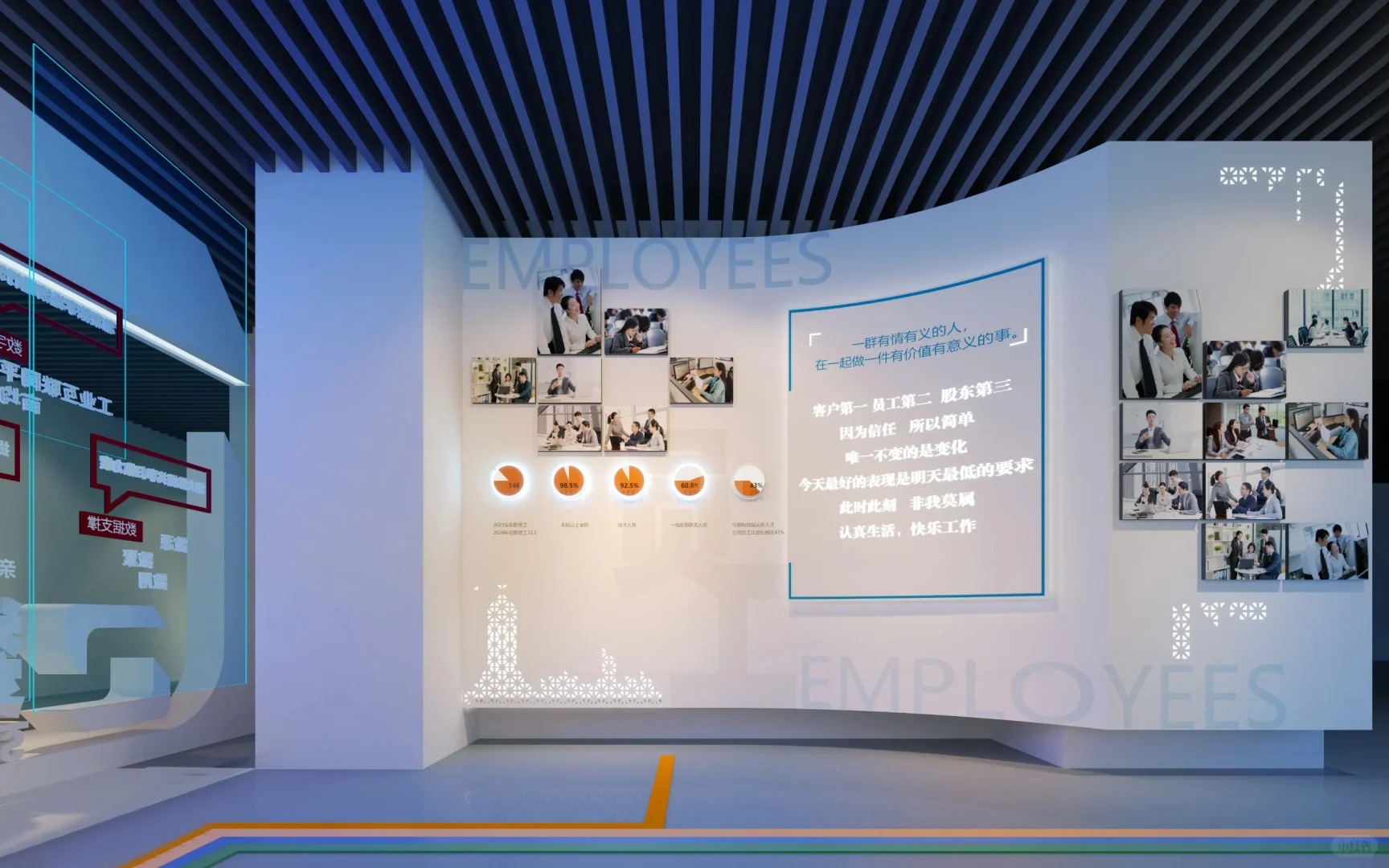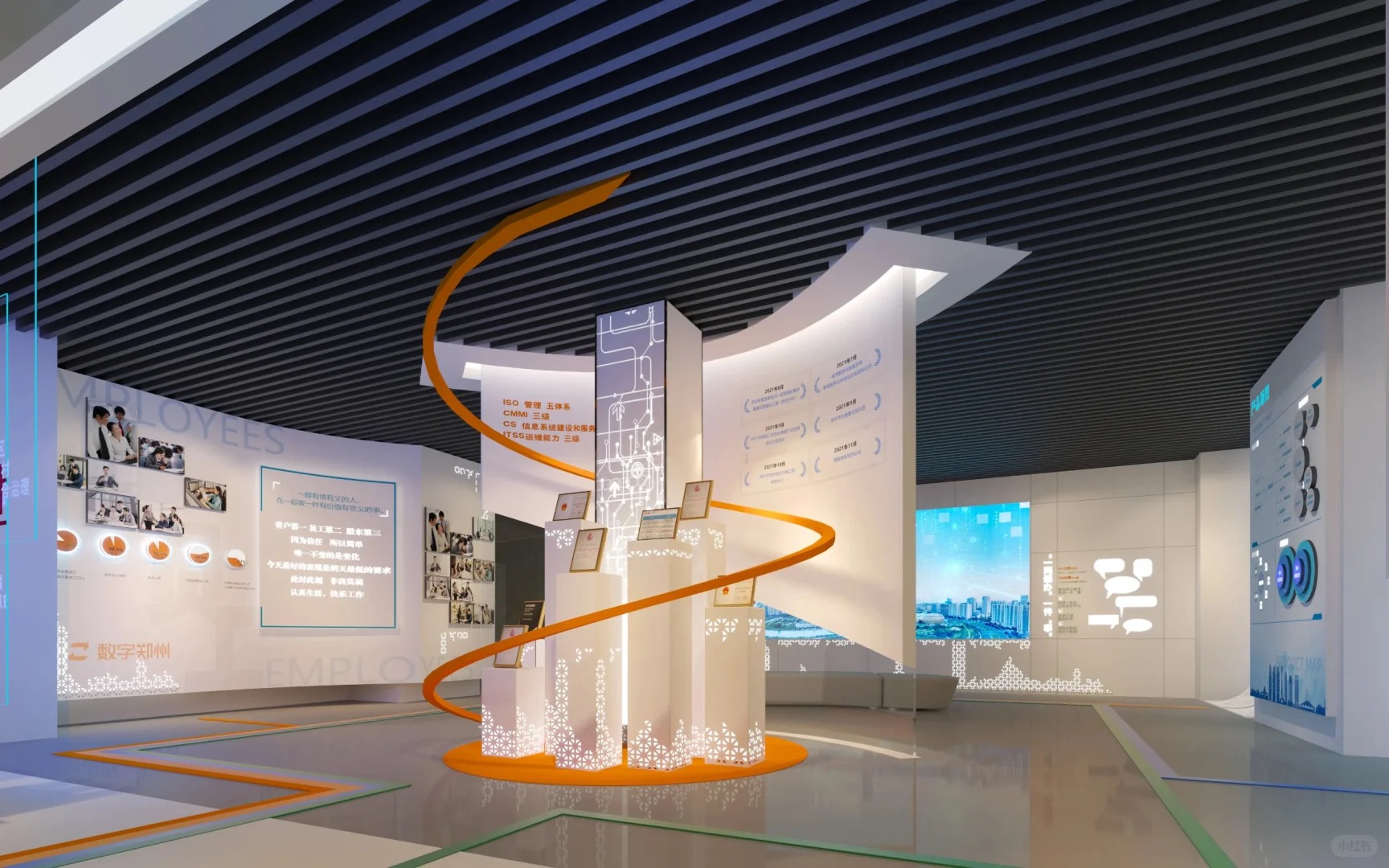空间环境综合了平面空间、立体空间结构等元素为设计理念,通过多媒体技术与科技手段突出展示企业文化及产品优势,创造出一种特殊的展览气氛,有效的吸引参与者。