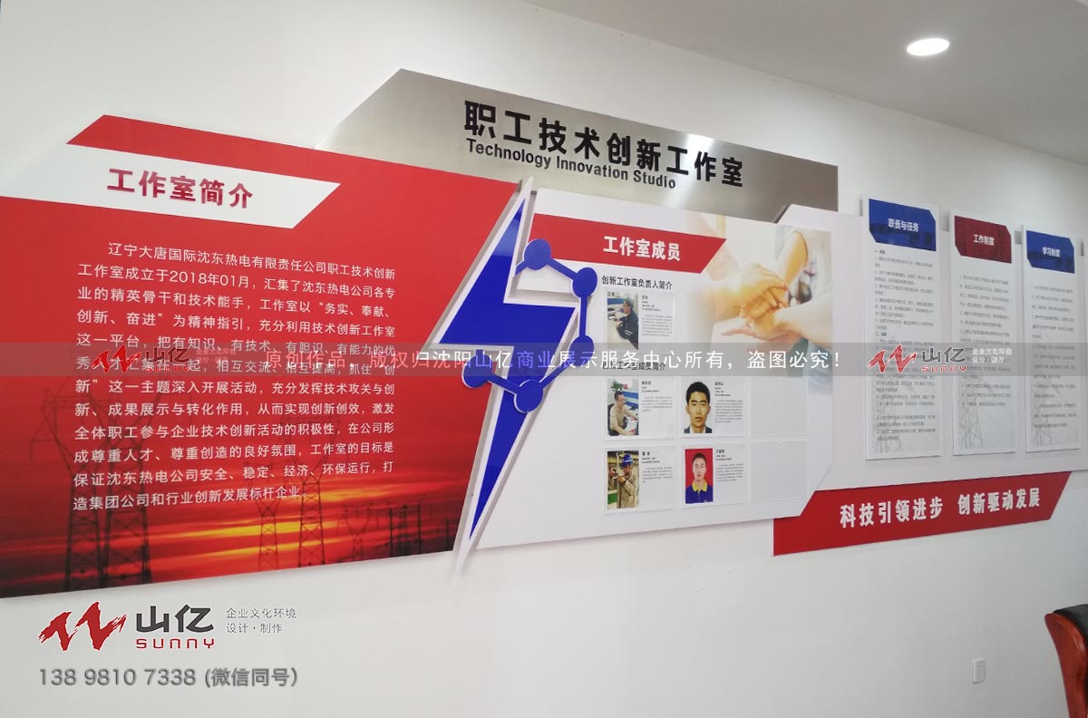大唐热电创新工作室文化墙设计,工作室以技术带头人领队开展电厂技术创新,为电厂良好运转提升效率不断改进进行技术突破。工作室文化墙以科室简介、成果展示、荣誉展示、文化精神为重点,较全面的展现工作室,同时吸纳更多有创新想法的员工。工作室文化墙设计