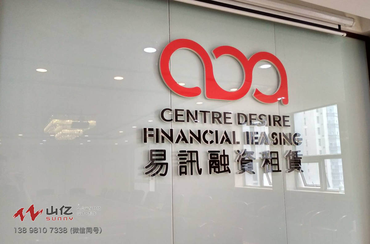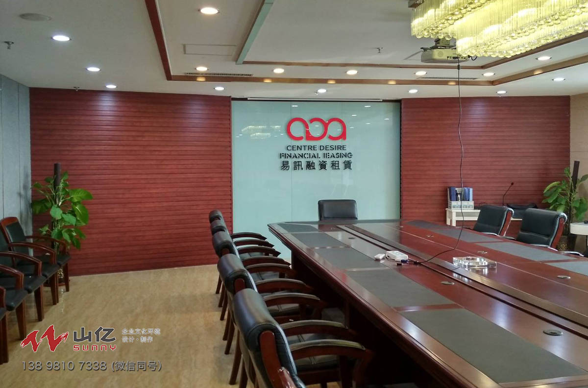 易迅融资租赁公司会议室logo背景墙,墙面设计依托原有弧形墙面,设计出环抱式背景墙,大面积采用生态木装饰简介大气不失高端,中心衬托烤漆玻璃,亚克力立体字。公司logo墙设计