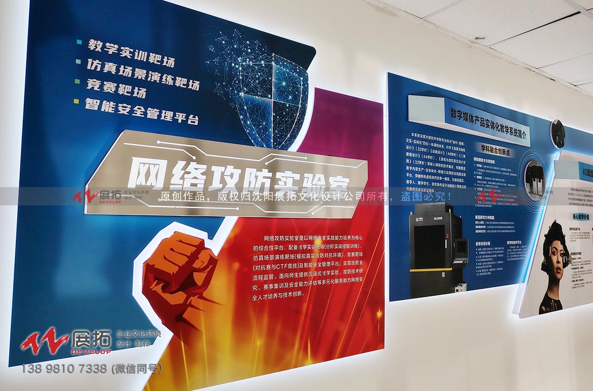 设计融入量子纠缠图形、星轨线条等元素,象征技术探索的无限可能,同时划分 “创新历程”“核心团队”“未来展望” 三大板块,用荧光材质勾勒时间轴,既展现实验室发展轨迹,又凸显前沿科技与人文创意的融合,让墙面成为连接现实与虚拟的视觉桥梁。